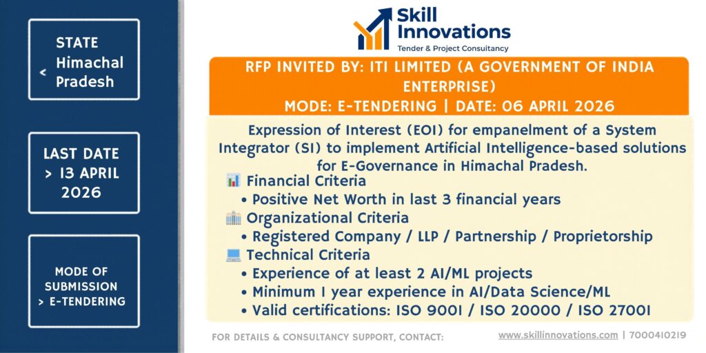 ITI Limited (A Government of India Enterprise) invites Expression of Interest (EOI) for empanelment of a System Integrator (SI) to implement Artificial Intelligence-based solutions for E-Governance in Himachal Pradesh.